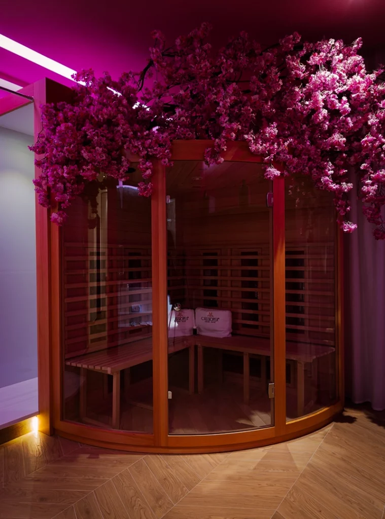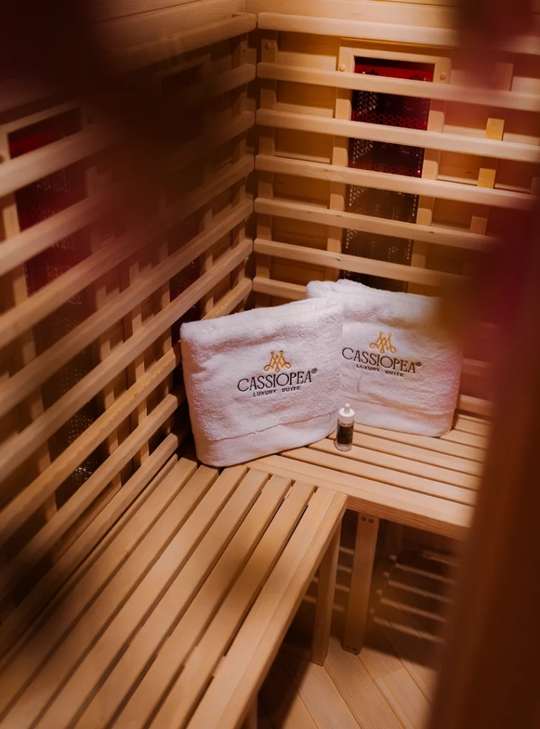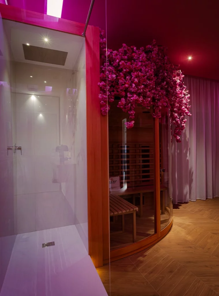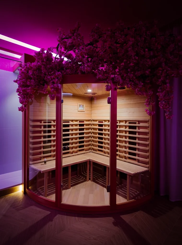 La sauna, profumata al legno di sandalo e tè verde, amplifica la sensazione di purificazione e quiete.